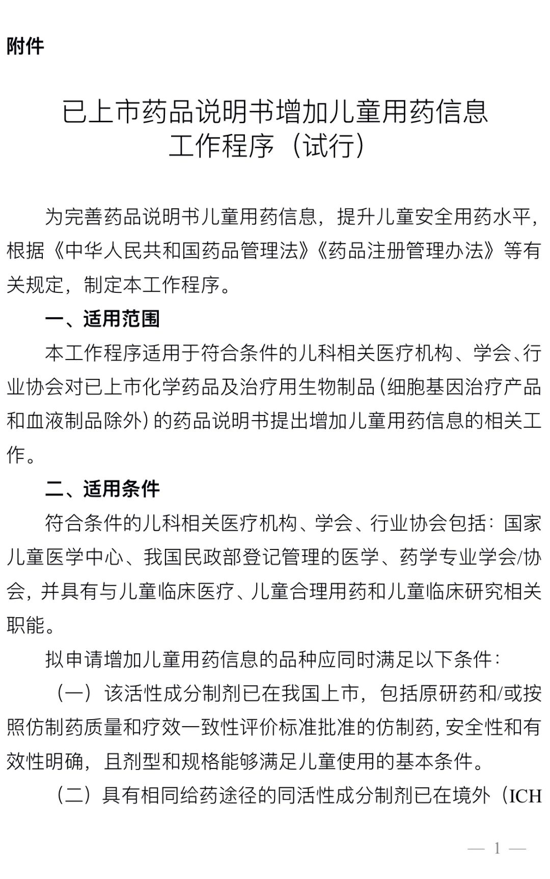 为完善已上市药品说明书儿童用药信息,提升儿童安全用药水平,国家药品监督管理局组织制定了《已上市药品说明书增加儿童用药信息工作程序(试行)》,现予发布。