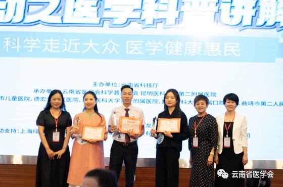 经 过一下午的激烈角逐,昆明医科大学第二附属医院熊静的《最熟悉的“陌生人”——如何与阿尔兹海默症患者沟通》斩获本次大赛一等奖;昆明医科大学第二附属医 院的刘立鑫、刘玉芹分别以《小小胆囊解释的大麻烦》和《拥抱生命——海姆立克法》获得二等奖;三等奖由昆明市儿童医院杨晨的《1个月内4人身亡!户外游玩 被它“叮”上不能拍,不能捏!》、德宏州人民医院王顺修的《儿童青少年脊柱健康管理》和昆明医科大学附属口腔医院胡耀燕的《熊孩子板命,牙齿摔出来了,自 救指南在此》获得。同时,杨晨、王敬斋等20位选手获得前期科普文章征集大赛奖项。