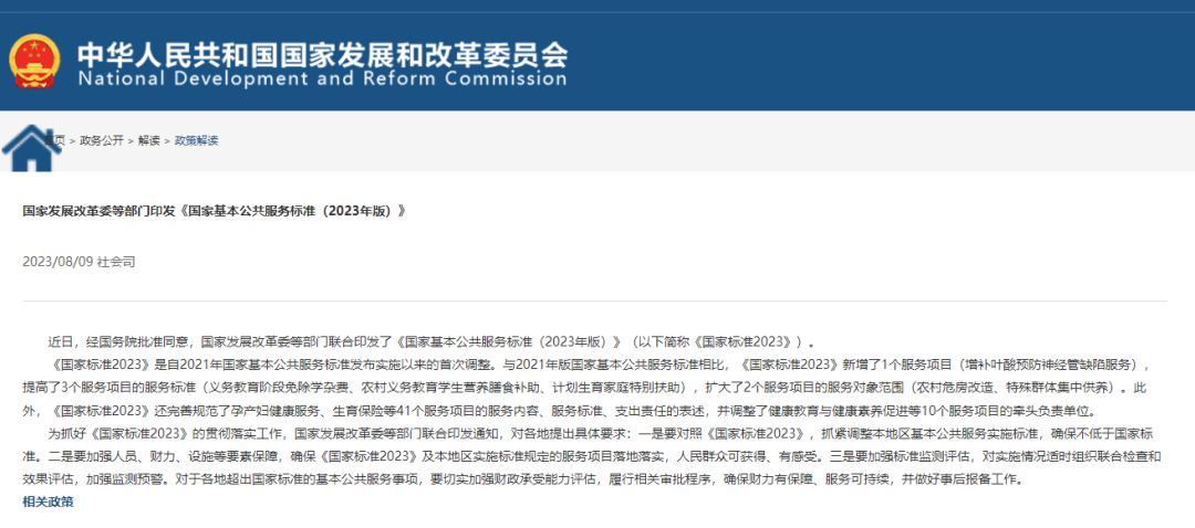 近日,经国务院批准同意,国家发展改革委等10部门联合印发了《国家基本公共服务标准(2023年版)》。