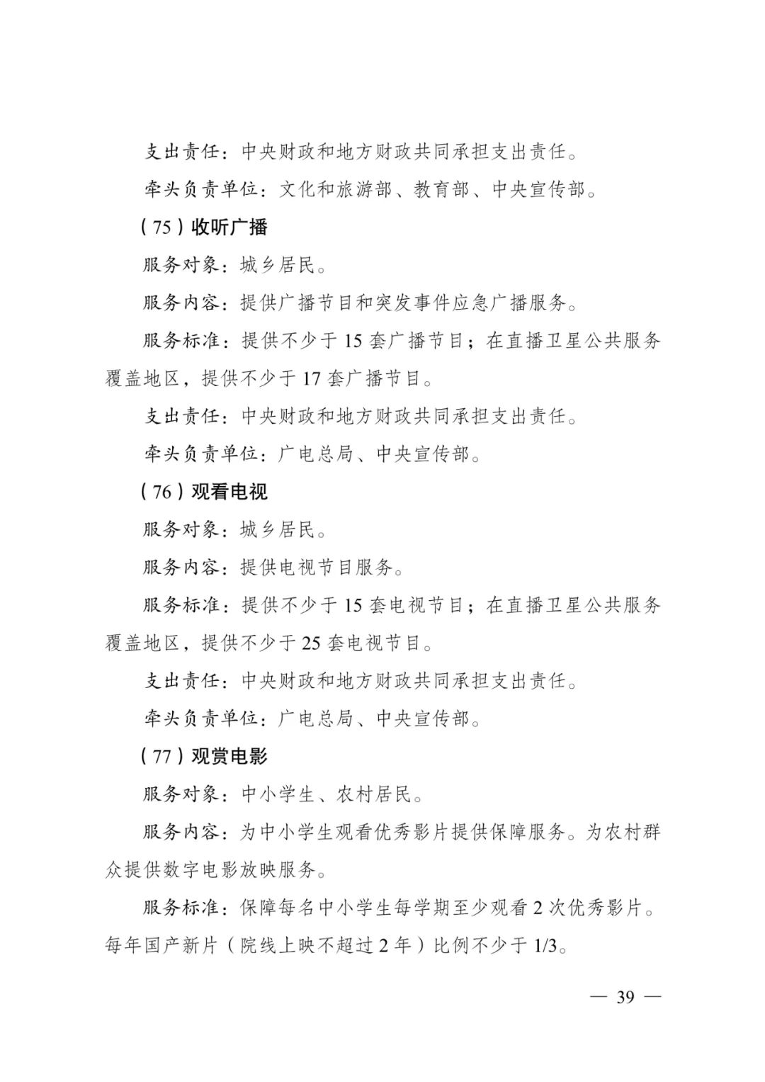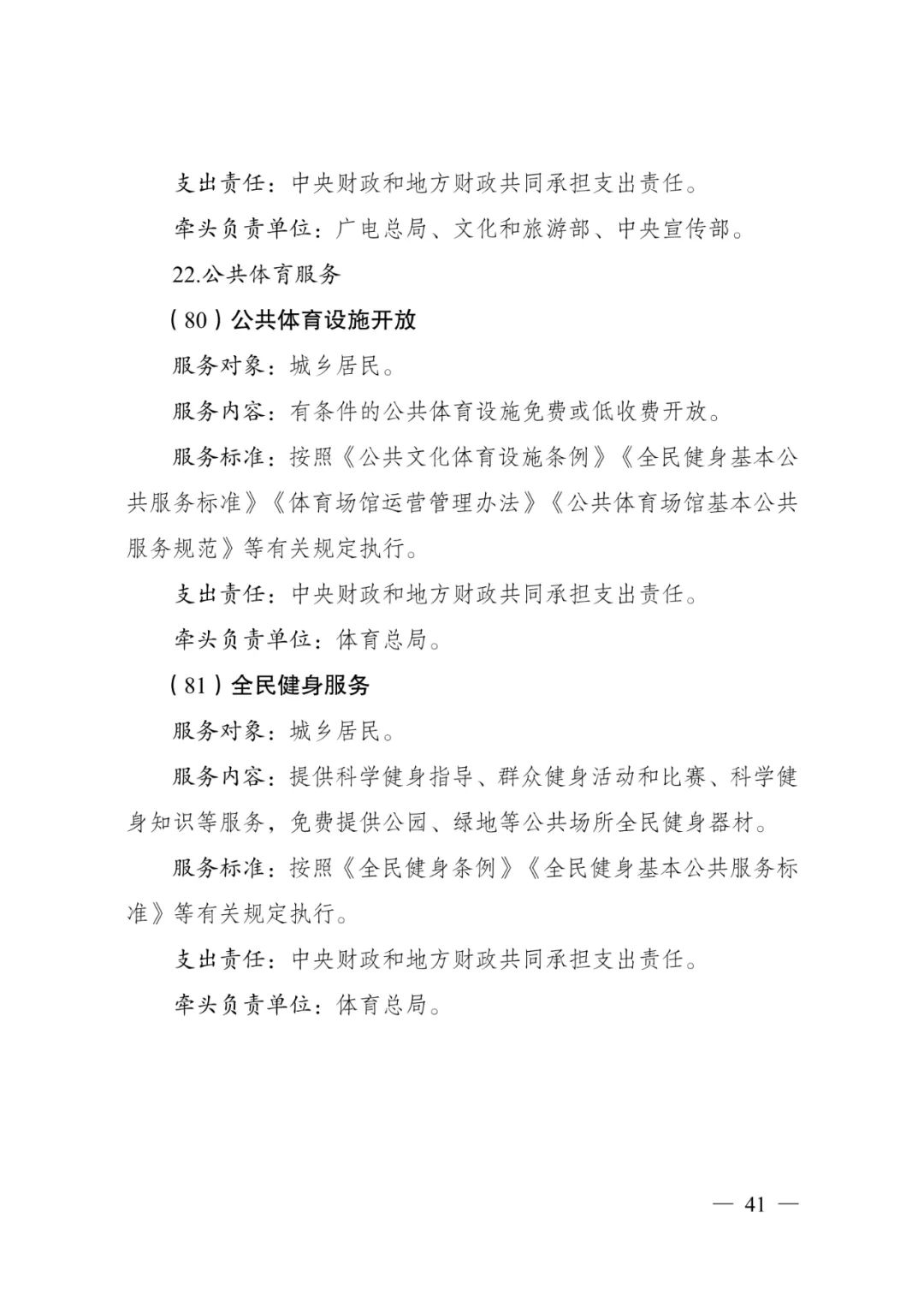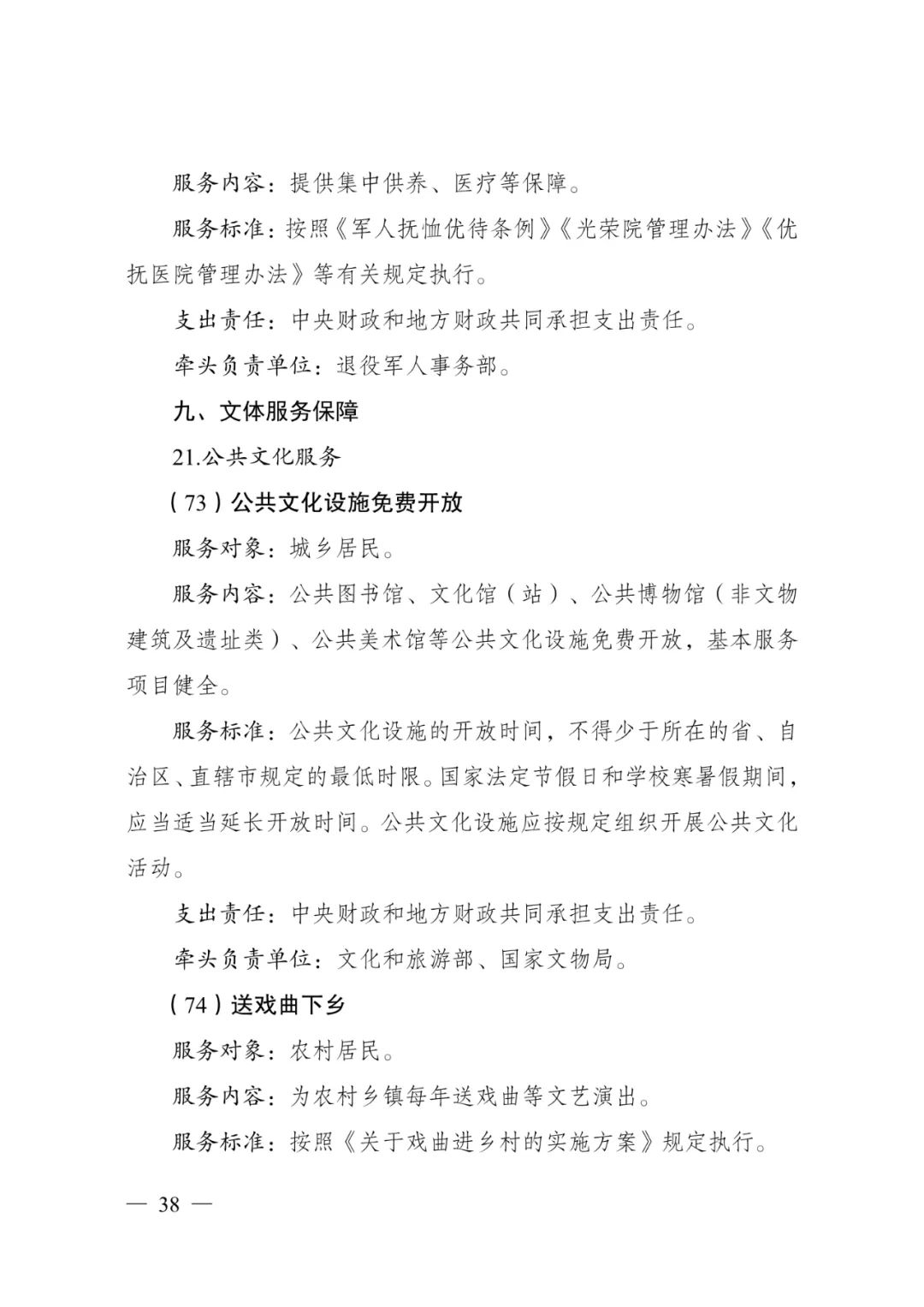一是国家基本公共服务标准出台实施。2021 年,国家首次出台基本公共服务标准,明确了幼有所育、学有所教、劳有所得、病有所医、老有所养、住有所居、弱有所扶、优军服务保障、文体服务保障等9个领 域80个基本公共服务项目的对象、内容、标准、支出责任和牵头负责单位,成为政府履行公共服务职责和人民享有相应权利的重要依据。