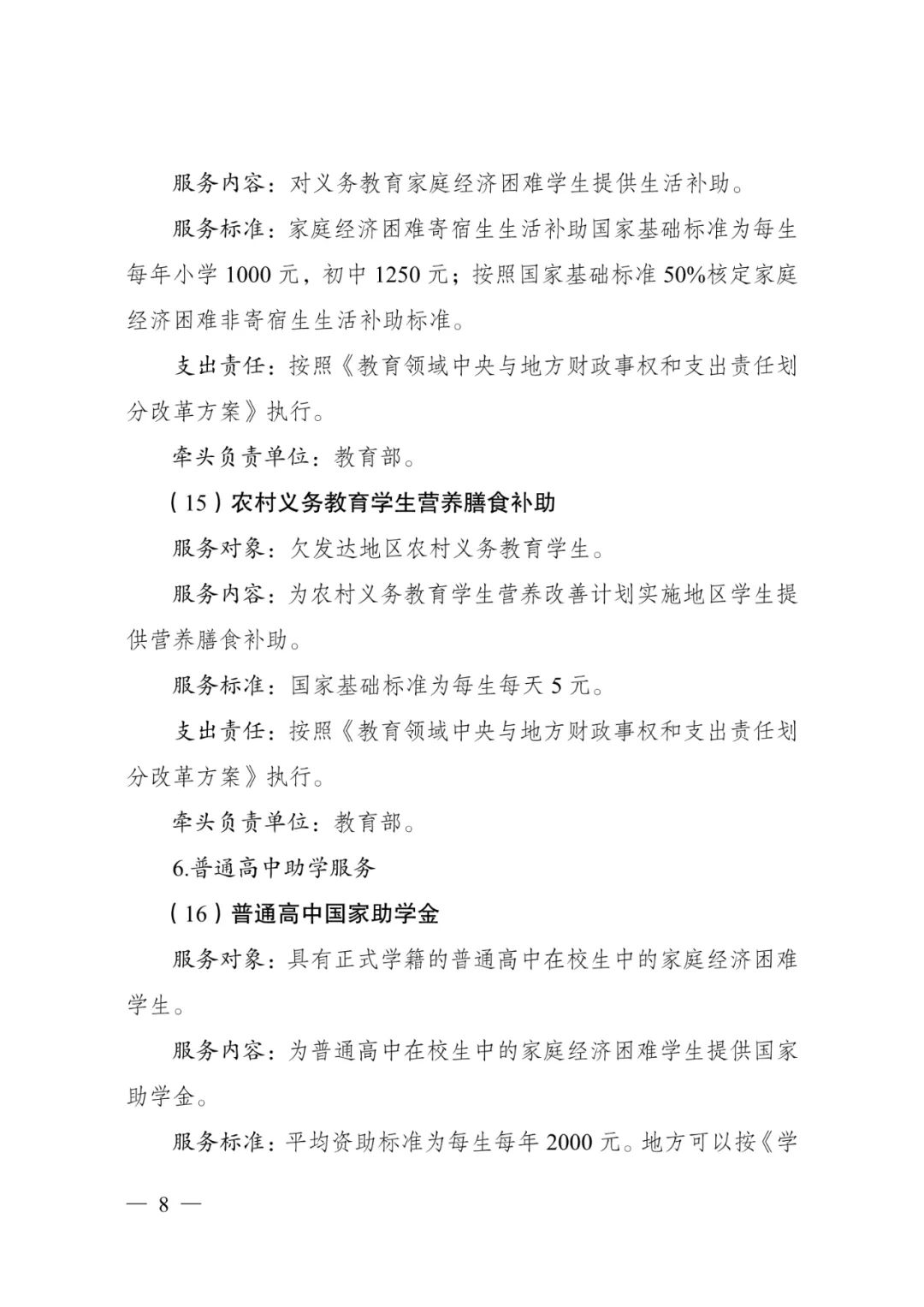 二是提高服务标准3项。包 括“义务教育阶段免除学杂费”“农村义务教育学生营养膳食补助”“计划生育家庭特别扶助”三个服务项目。其中,义务教育阶段生均公用经费基准定额小学由 650元提高到720元,初中由850元提高到940元,寄宿制学校公用经费在生均公用经费基准定额基础上按寄宿生数年生均增加300元,提高了100 元。“农村义务教育学生营养膳食补助”的国家基础标准由原来的每生每天4元提高至每生每天5元。“计划生育家庭特别扶助”服务项目中,不同类别的服务对象 每人每月的特别扶助金有了明显的提高,增长幅度均在30%以上。