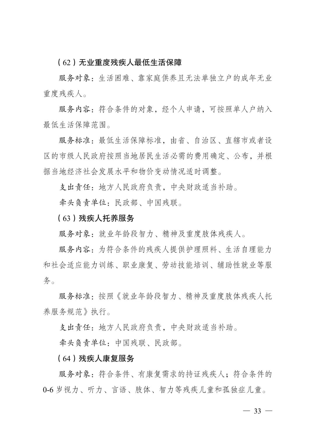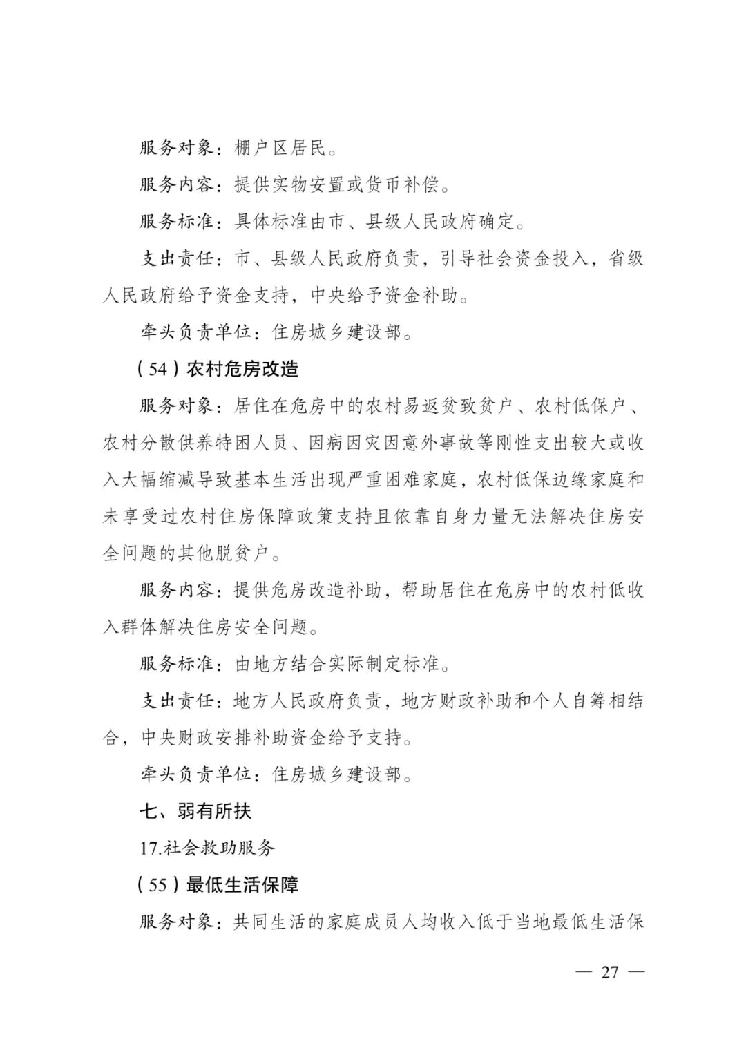 三是扩大服务对象2项。包括农村危房改造、特殊群体集中供养2项服务,分别将服务对象扩大到农村低保边缘家庭和未享受过农村住房保障政策支持且依靠自身力量无法解决住房安全问题的其他脱贫户,以及退出现役的一级至四级残疾军人需要长年医疗或者独身一人不便分散安置的军人。