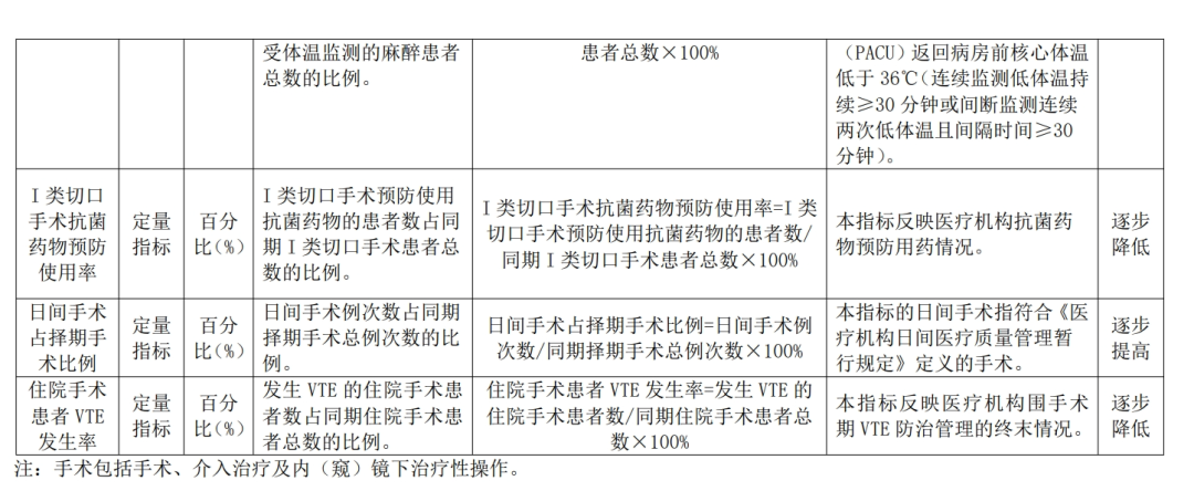 利 用3年时间,进一步完善手术质量安全管理体系,形成科学规范、责权清晰、运行顺畅的管理机制。到2025年末,住院患者围手术期死亡、手术并发症、麻醉并 发症等负性事件发生率进一步下降,非计划重返手术室再手术率不高于1.8‰,住院患者手术后获得性指标发生率不高于7.5‰,手术麻醉期间低体温发生率、 I类切口手术抗菌药物预防使用率进一步降低,日间手术占择期手术的比例进一步提高,四级手术术前多学科讨论制度得到全面落实。